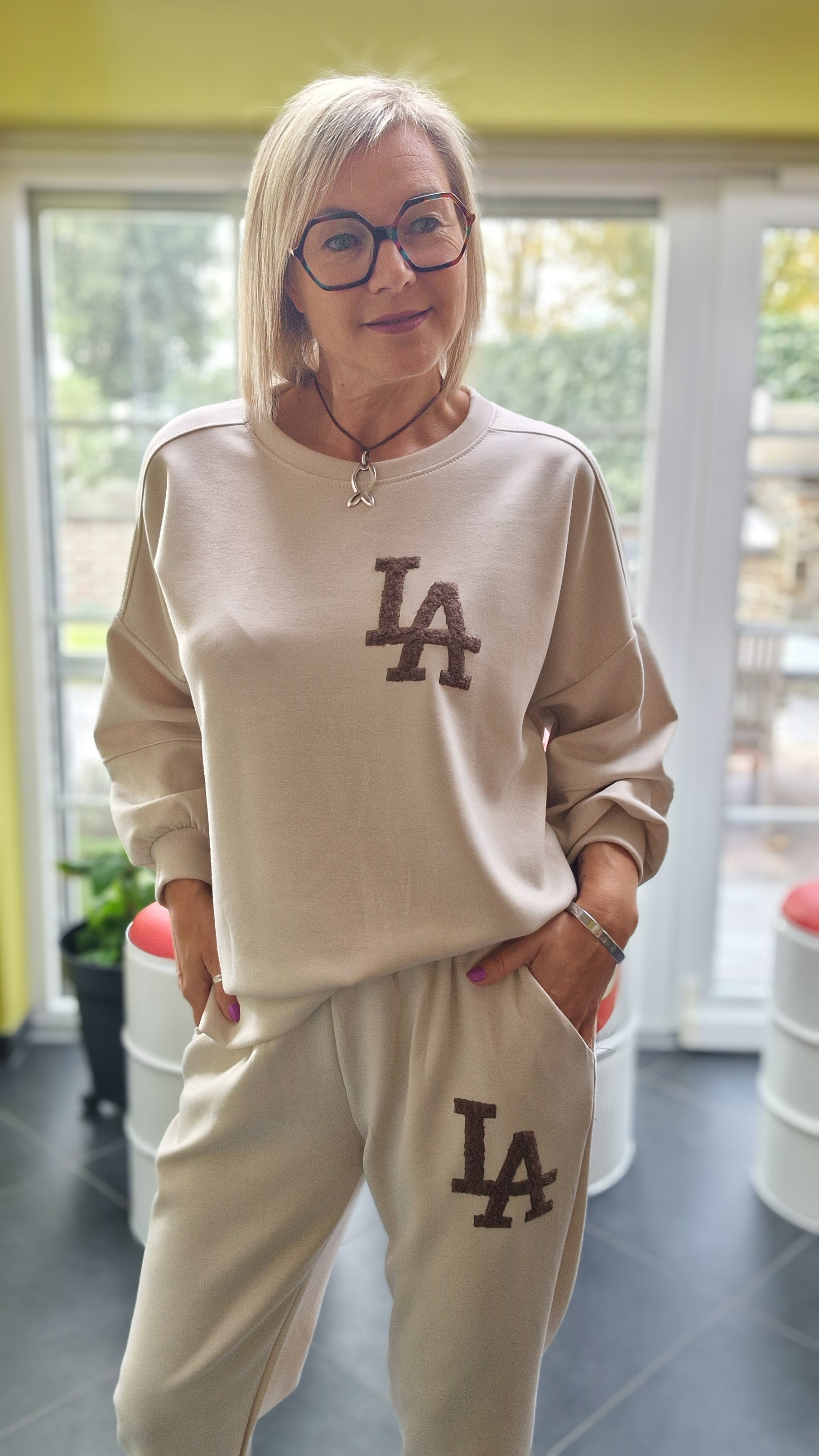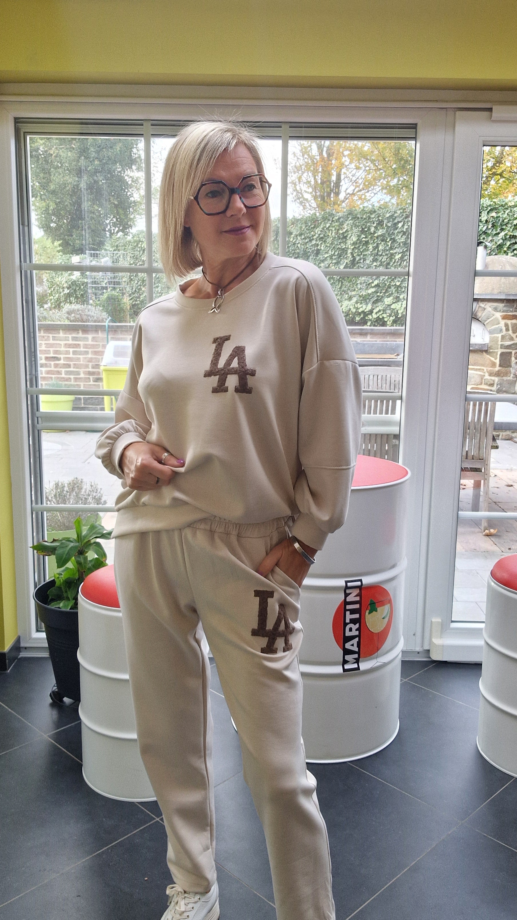 Superbe ensemble confort. Imprimé L.A. ton sur ton sur blouse et pantalon.