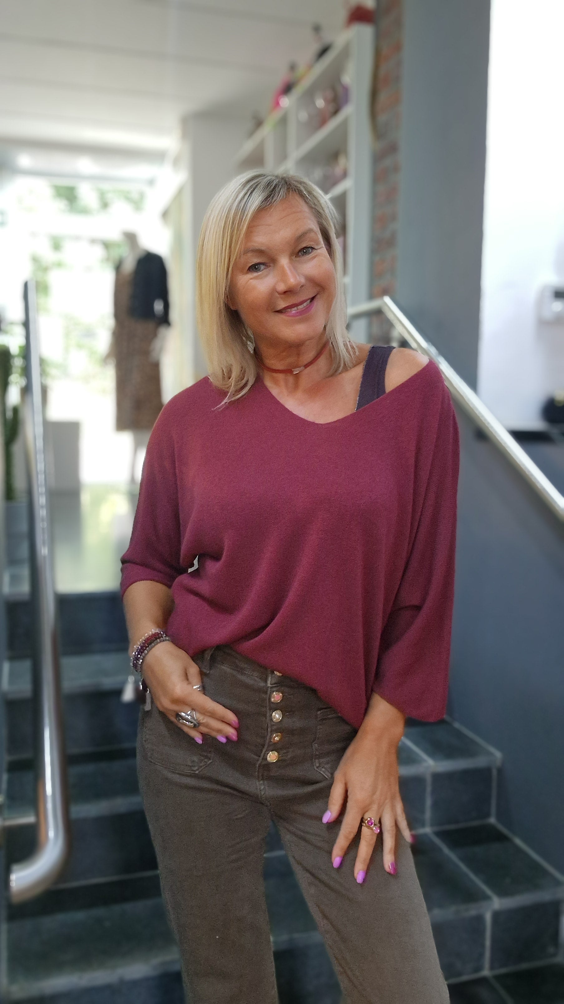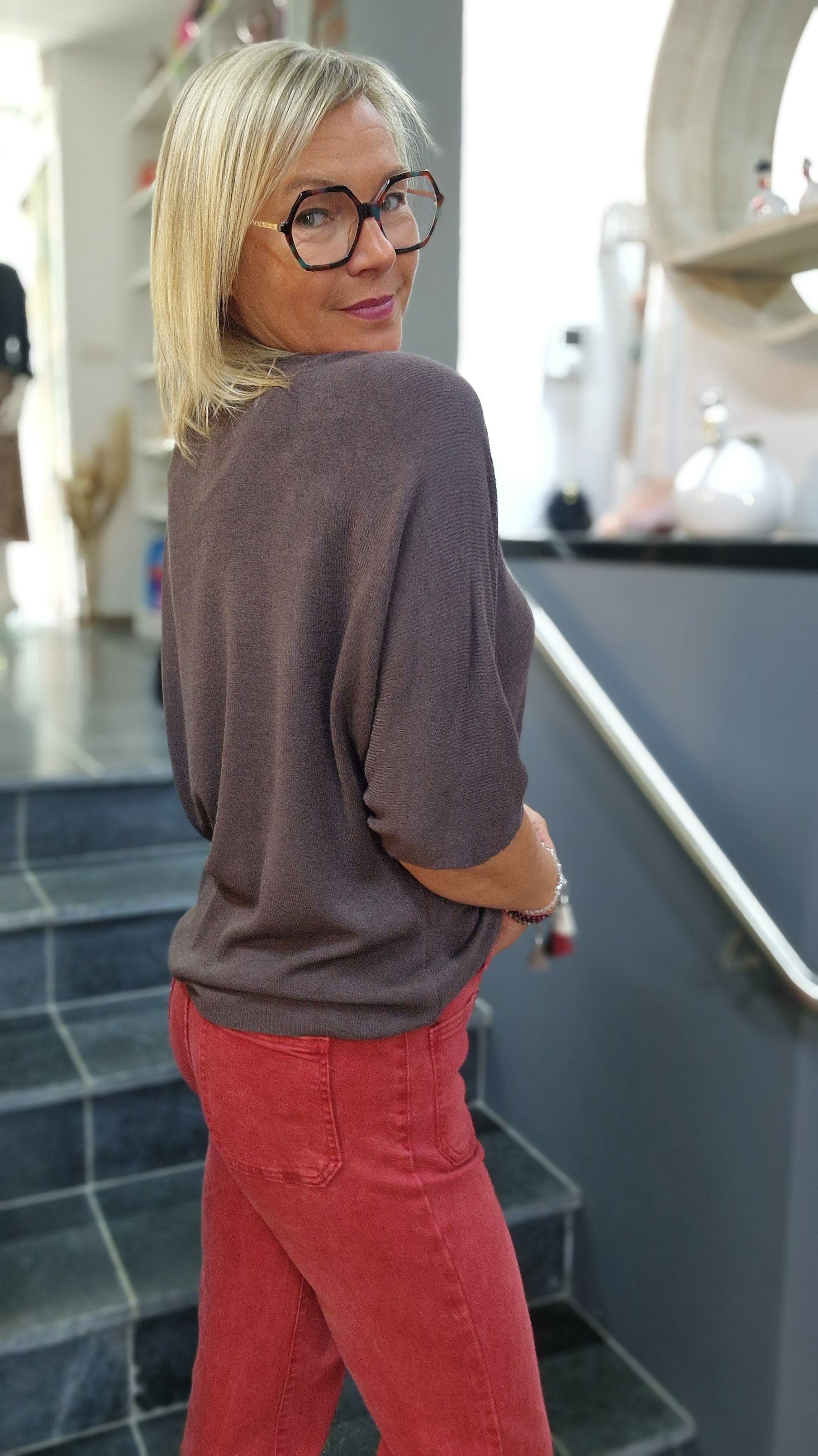 Petit pull basique fluide en jersey. Assez ample, 1/2 manche, col V.
