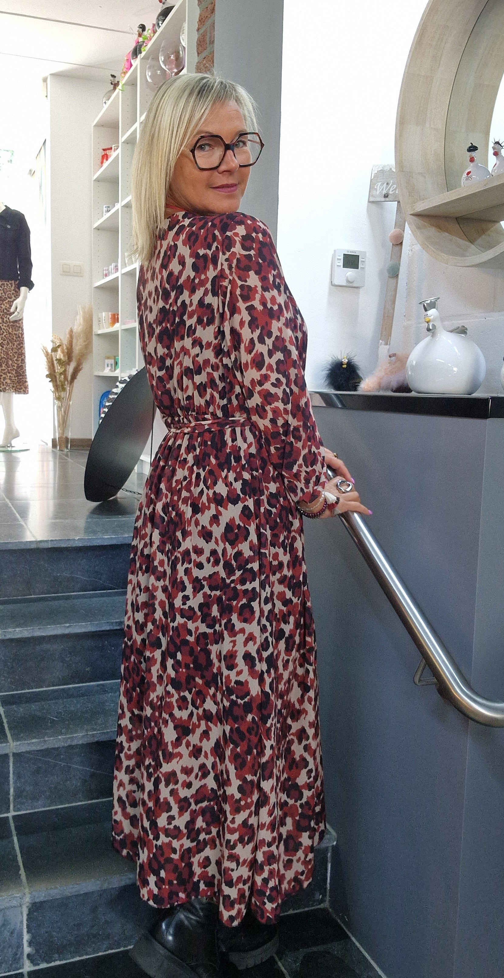 Superbe robe longue en voile doublée. Motif léopard dans les tons bordeaux, noir et beige.