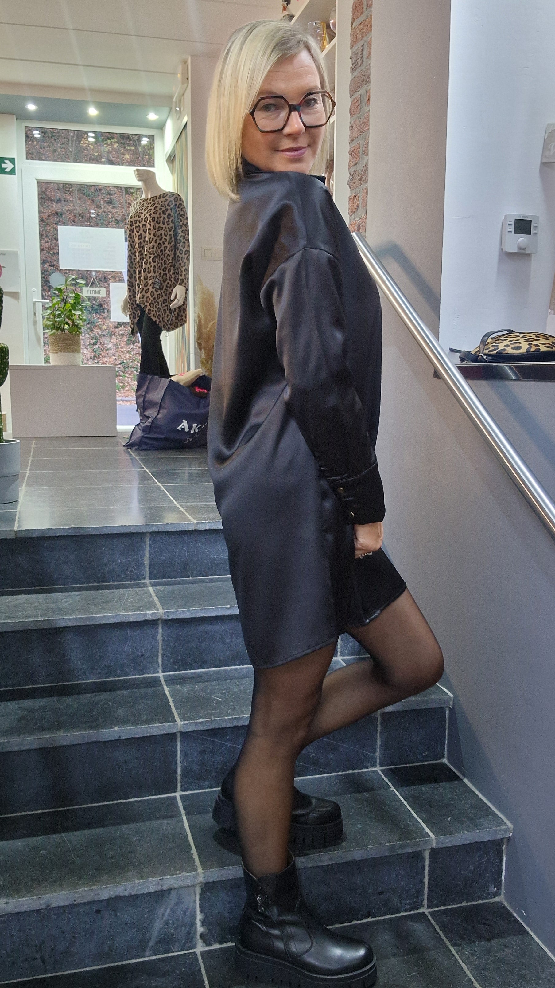 Robe chemisier en satin noir. Peut se porter en tunique, ouverte avec un top en-dessous.